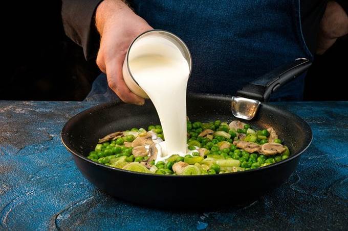 • Добавить зеленый горошек, продолжая обжаривать. Влить сливки и потушить все минут 5, посолить по вкусу.