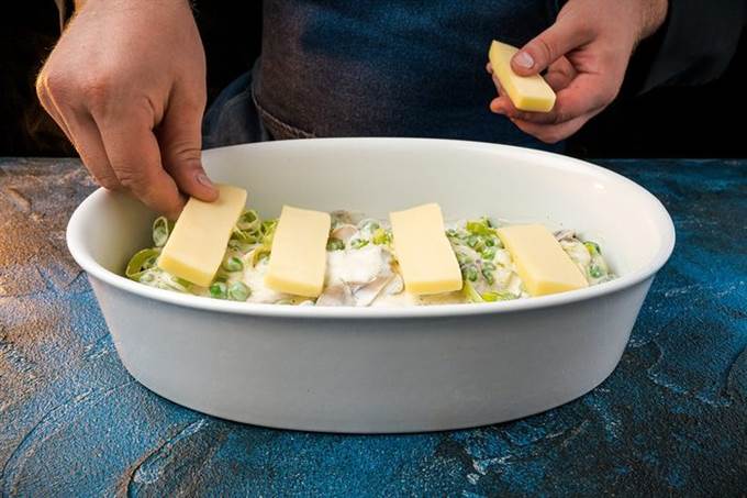 • Выложить овощную смесь на рыбу. Сверху выложить кусочки моцареллы. Поставить в разогретую до 180°С духовку. Запекать минут 15 — 20 до зарумянивания сыра.