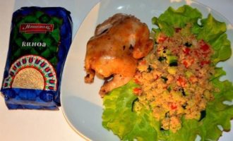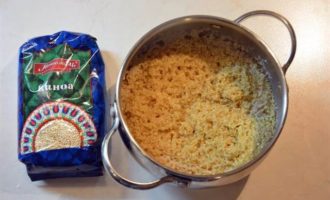 • Киноа ТМ «Националь» отварить. Снять с огня, добавить овощи, соль, перец, оливковое масло и перемешать.