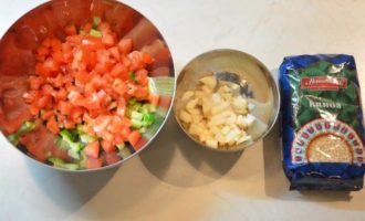 • Огурцы и помидоры нарезать кубиками. Лук мелко нарезать и замариновать винным уксусом.