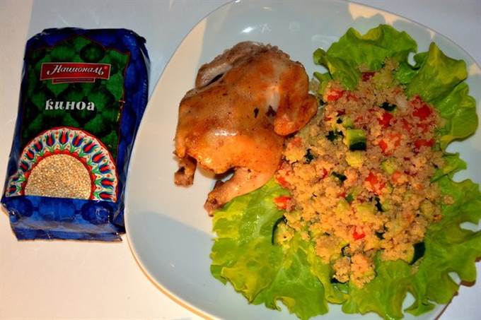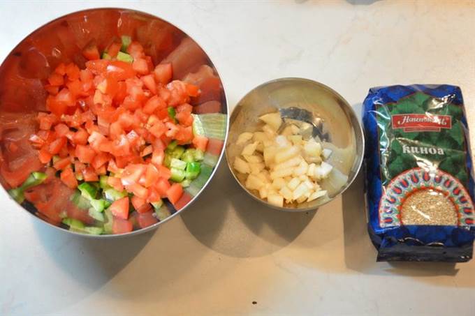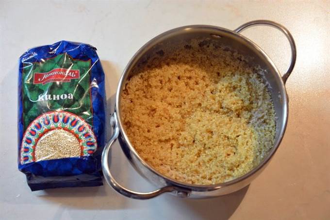 • Киноа ТМ «Националь» отварить. Снять с огня, добавить овощи, соль, перец, оливковое масло и перемешать.