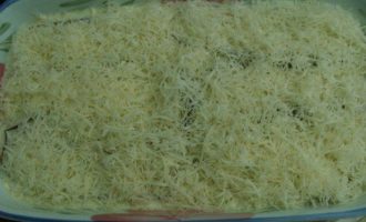 • Посыпаем тёртым сыром. Ставим в духовку на 20-25 минут. Соус очень хорошо схватится, хоть изначально он жидкий. Запеканку немного остужаем.