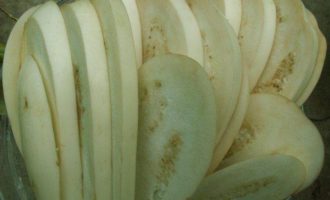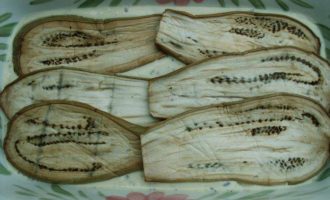 • Баклажаны нарезаем вдоль толщиной около 1 см. Духовку разогреваем на 180°С. Кладём баклажаны в духовку на решётку. Если у Вас есть сковорода-гриль, то великолепно их обжарить именно на ней. Также можно пожарить на обычной сковороде на масле, но слишком много масла берут баклажаны, а летом хочется легких блюд. Баклажаны запекаем до мягкости. Мне понадобилось 20 минут. Баклажаны я никак предварительно не обрабатывала, потому что белые вобще не горчат. Если у Вас обычные, то после того, как Вы их нарезали, посолите их и дайте постоять, пока они не дадут сок (минут 20 обычно), промойте и отожмите, а потом обжаривайте.