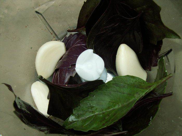 • Базилик и чеснок мелко рубим (я использовала измельчитель). Яйца взбиваем. Твёрдый сыр натираем на мелкой тёрке.