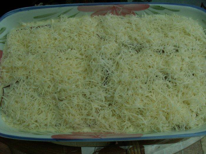 • Посыпаем тёртым сыром. Ставим в духовку на 20-25 минут. Соус очень хорошо схватится, хоть изначально он жидкий. Запеканку немного остужаем.