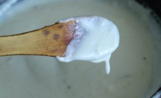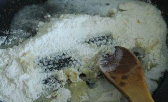 Добавить муку и перемешать до получения однородной массы. Дать смеси остыть в течение 2 мин.