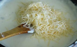 Добавить мускатный орех, соль, 80 гр. натертого сыра, все хорошенько перемешать.