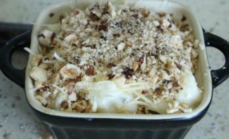 Сверху посыпать оставшимся сыром и измельченным жареным фундуком. Запекать в разогретой до 180 С духовке 10-15 минут, а затем поставить на 1-2 мин. под горячий гриль, чтобы образовалась ореховая корочка…