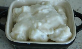 В готовый соус добавить цветную капусту, перемешать (так, чтобы соцветия капусты были покрыты соусом) и выложить в порционные формочки или одну большую форму.