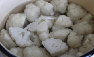 Разделить капусту на соцветия, отварить в течение 7-10 мин. Готовую капусту откинуть на дуршлаг и дать жидкости стечь.