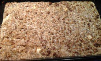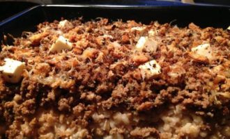 Сверху сыра выкладываем фарш (на этом этапе можно посыпать сверху измельченными и обжаренными хлебными крошками и украсить кусочками феты и минуть десять подержать всё это в горячей духовке и подавать).