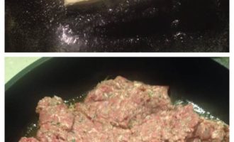 Разогреваем масло и обжариваем на нем фарш (фарш свинина-говядина, зелень, лук, соль), добавляя бульон.