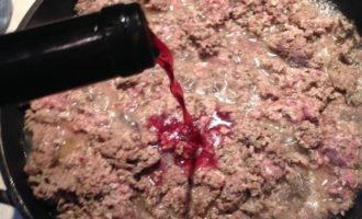 Как выкипит бульон, заливаем вином и готовим на среднем огне, пока мясо пропитается ароматами и выпарится алкоголь. (соус болоньезе)