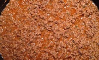 Добавляем томатное пюре и немного еще обжариваем фарш. Не забываем перемешивать!