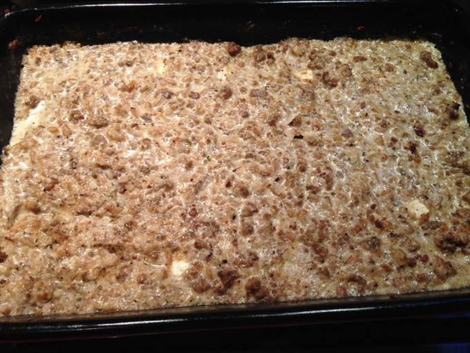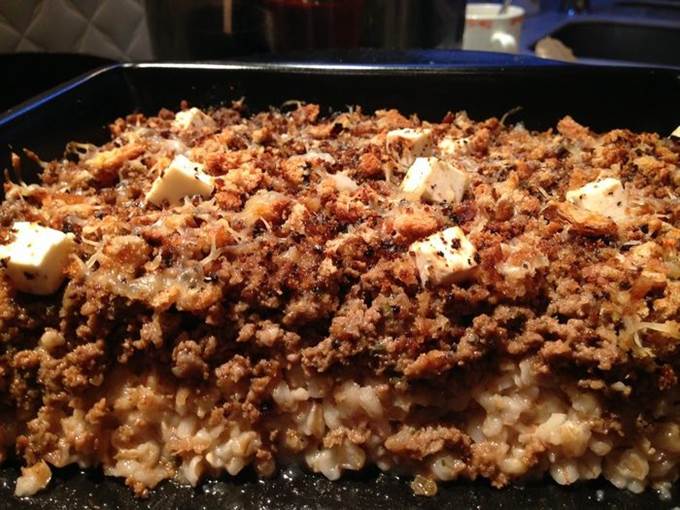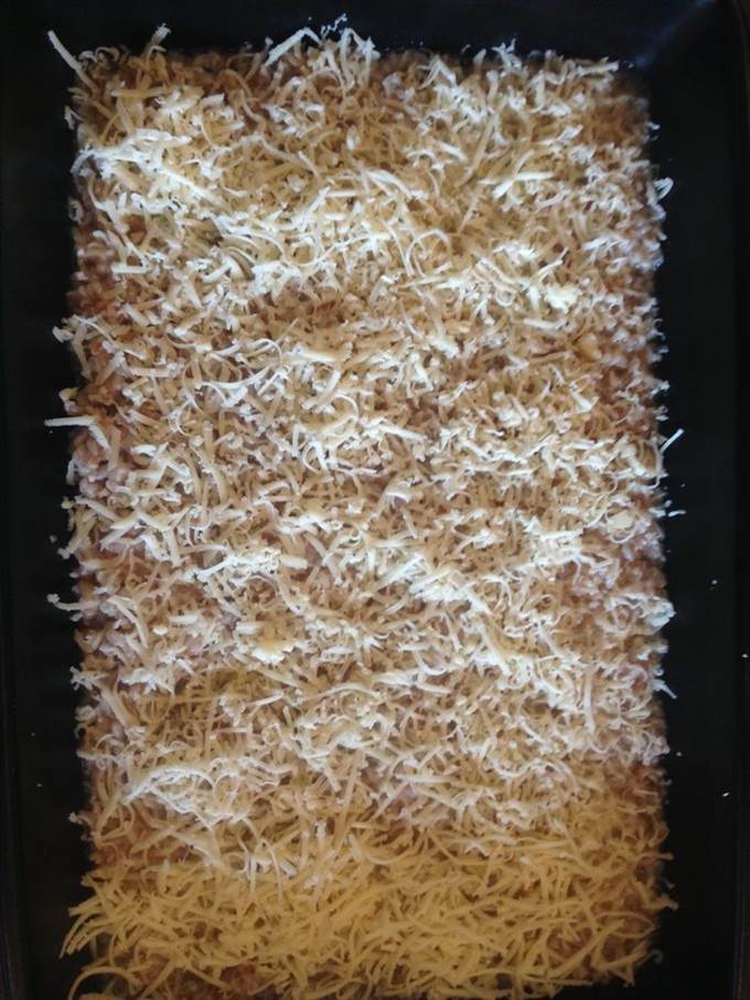 Сверху сыра выкладываем фарш (на этом этапе можно посыпать сверху измельченными и обжаренными хлебными крошками и украсить кусочками феты и минуть десять подержать всё это в горячей духовке и подавать).