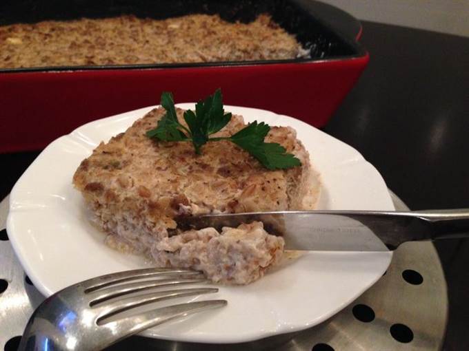 Далее даем немного остыть, разрезаем на кусочки (как лазанью) и подаем с зеленью!