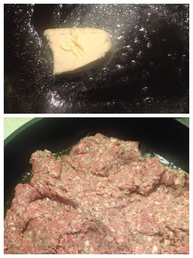 Разогреваем масло и обжариваем на нем фарш (фарш свинина-говядина, зелень, лук, соль), добавляя бульон.