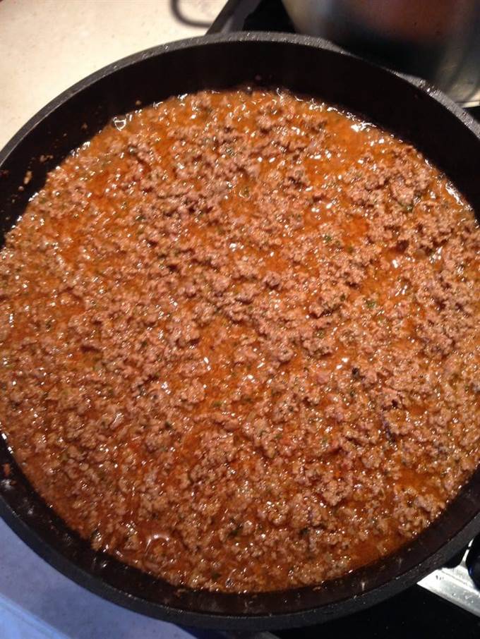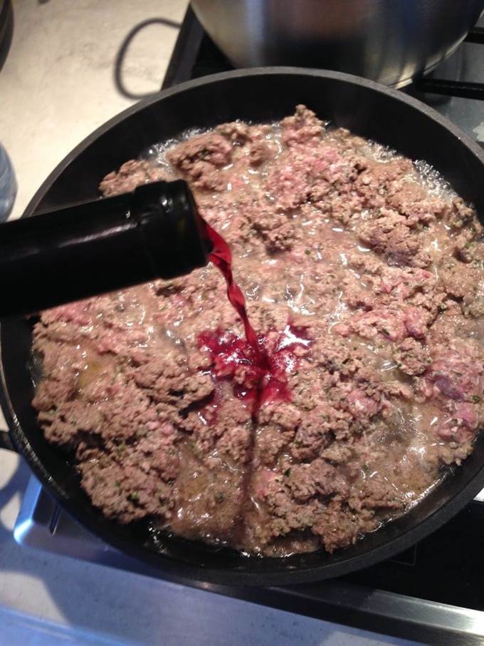 Как выкипит бульон, заливаем вином и готовим на среднем огне, пока мясо пропитается ароматами и выпарится алкоголь. (соус болоньезе)