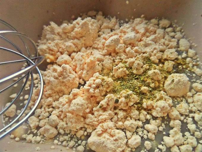 Смешиваем яйцо или яичный порошок, как у меня (3 ст. л.) со сметаной и водой. Добавить любимые приправы по вкусу.
