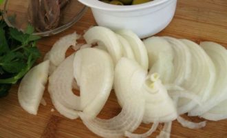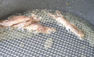 Рыбу отварить в небольшом количестве подсоленной воды (чтобы вода только прикрывала рыбу) с добавлением лаврового листа. Положить анчоусы на разогретую с оливковым маслом сковороду.