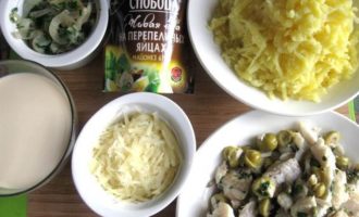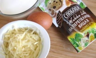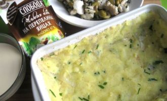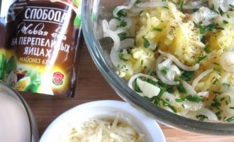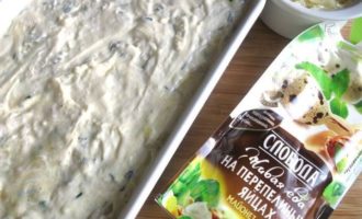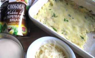 В верхний слой картофеля также добавить яйцо со сливками, выровнять, смазать слоем майонеза ТМ «Слобода» На перепелиных яйцах.