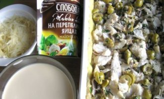 На него положить равномерно рыбу с оливками и каперсами, налить часть заливки.