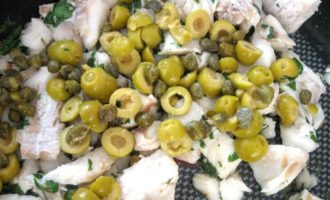 А также каперсы, нарезанные оливки, прогреть, чтобы оставшаяся жидкость выпарилась (полминуты).
