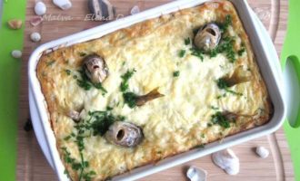 Поставить в духовку на 15 минут. Затем температуру духовки увеличить до 220°С, запекать еще 15 — 20 минут до румяной корочки. Вынуть из духовки, дать немного остыть, декорировать хвостиками консервированной копченой корюшки в масле (килькой), головами воблы, мелко нарезанным шнитт-луком.