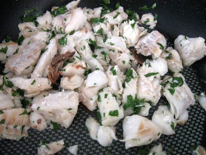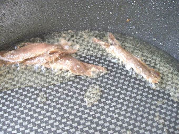 Рыбу отварить в небольшом количестве подсоленной воды (чтобы вода только прикрывала рыбу) с добавлением лаврового листа. Положить анчоусы на разогретую с оливковым маслом сковороду.