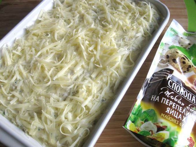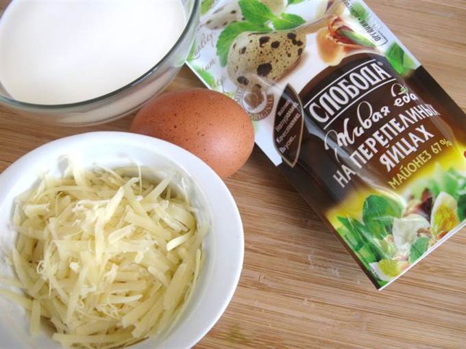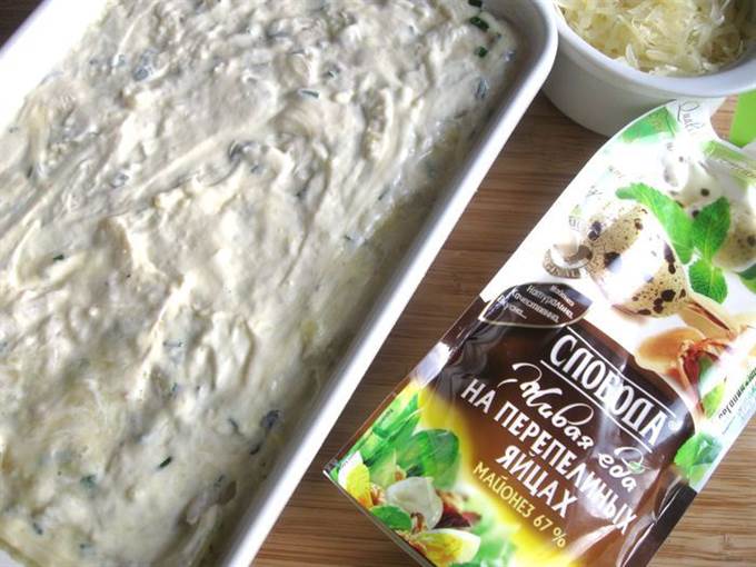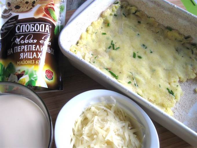 В верхний слой картофеля также добавить яйцо со сливками, выровнять, смазать слоем майонеза ТМ «Слобода» На перепелиных яйцах.