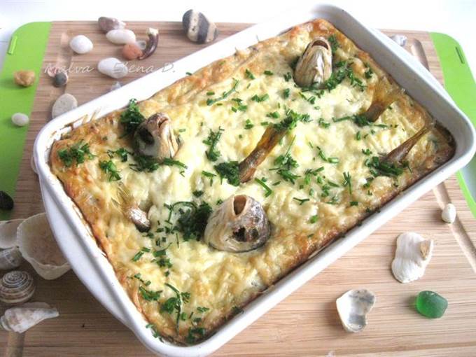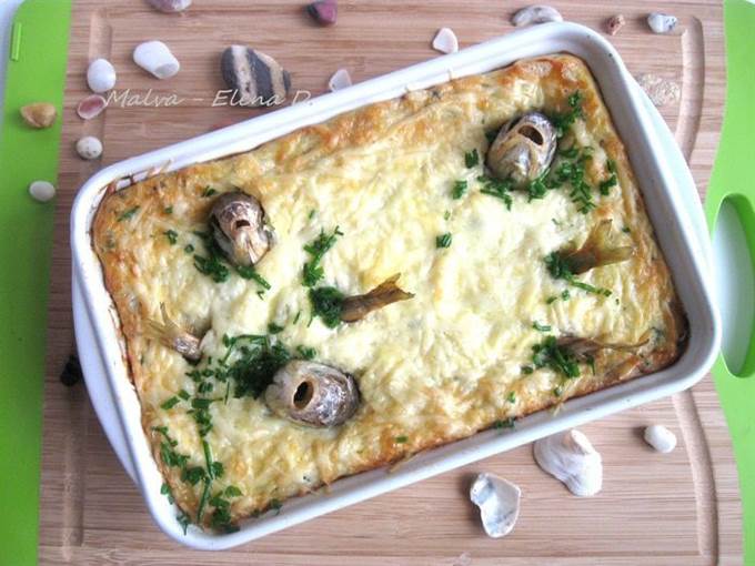 Поставить в духовку на 15 минут. Затем температуру духовки увеличить до 220°С, запекать еще 15 — 20 минут до румяной корочки. Вынуть из духовки, дать немного остыть, декорировать хвостиками консервированной копченой корюшки в масле (килькой), головами воблы, мелко нарезанным шнитт-луком.