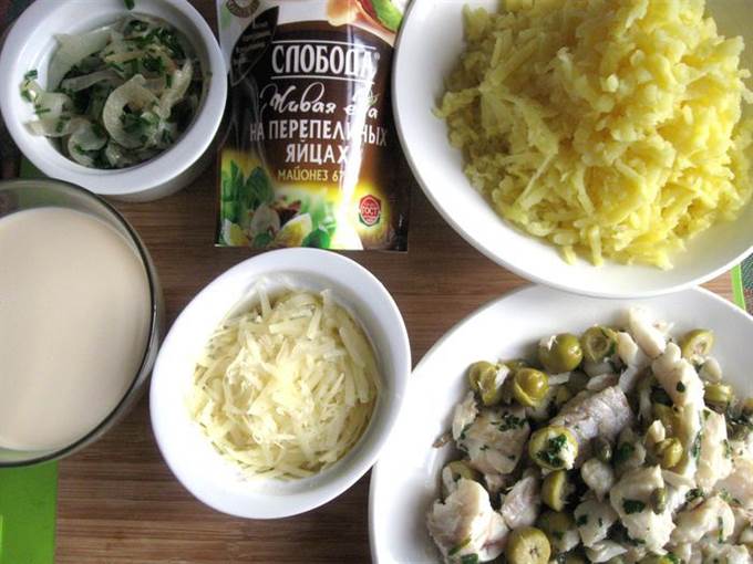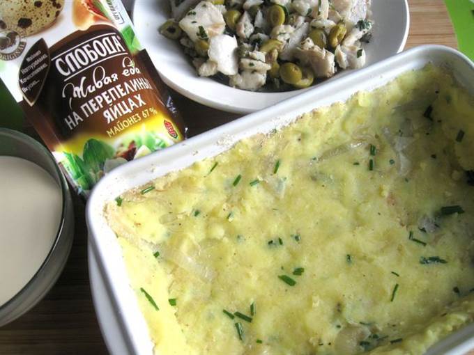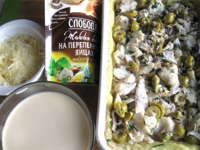 На него положить равномерно рыбу с оливками и каперсами, налить часть заливки.