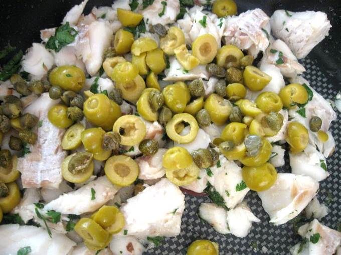 А также каперсы, нарезанные оливки, прогреть, чтобы оставшаяся жидкость выпарилась (полминуты).