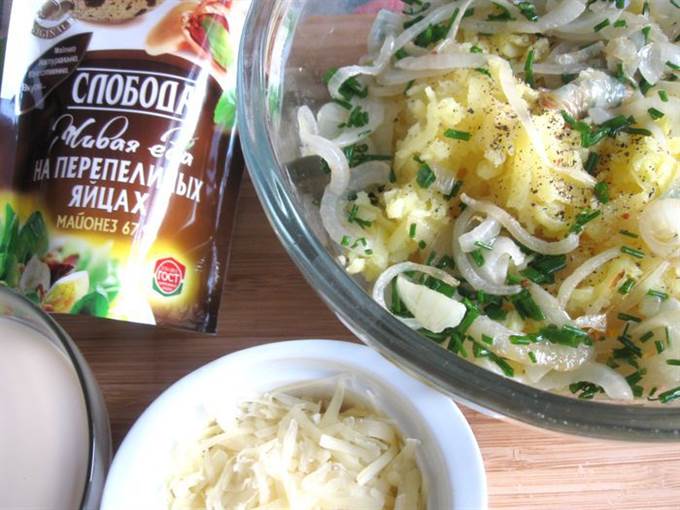Добавить к картофелю соль, перец, лук репчатый, шнитт-лук, перемешать.