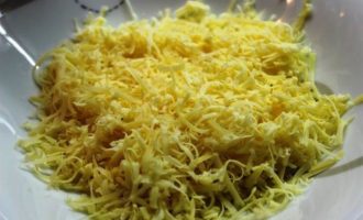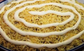 Присыпать сверху оставшимся тертым сыром и аккуратно нанести слой майонеза.