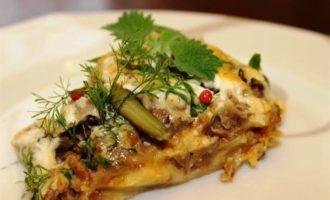 Украсить по своему усмотрению. Я предлагаю подать маринованные корнишоны, укроп и зеленый лук… Они очень хорошо сочетаются с картофелем и мясом. Перед сервировкой лучше выдержать запеканку в течение 15 минут, чтобы все слои схватились и немного держали форму.