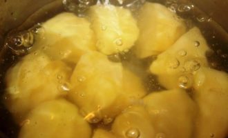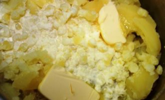 Приготовить картофельное пюре (не очень жидкое): размять отварной картофель, добавить масло сливочное (25 грамм) и сливки. Перемешать.