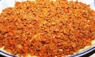 Присыпать сыром (1/4 часть) и выложить обжаренный мясной фарш.
