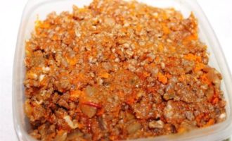 Писать намного дольше, чем готовить это блюдо). Для начала необходимо отварить телятину, а также подготовить мясной фарш (фарш может быть из любого мяса). Для этого: поджарить нарезанный мелкими кубиками лук и томатную пасту в небольшом количестве растительного масла (1 ст.л.), добавить свежий фарш, соль и перец. Тушить минут 15 на среднем огне. У меня уже был готовый обжаренный фарш и отварное мясо.