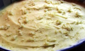 Форму для запекания смазать маслом, выложить картофельное пюре. Сверху натереть чеснок