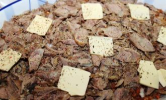 Присыпать еще одной часть сыра (1/4) и выложить нарезанное тонкими пластинками отварное мясо. Сверху разложить остатки сливочного масла (25 грамм), посолить и поперчить.