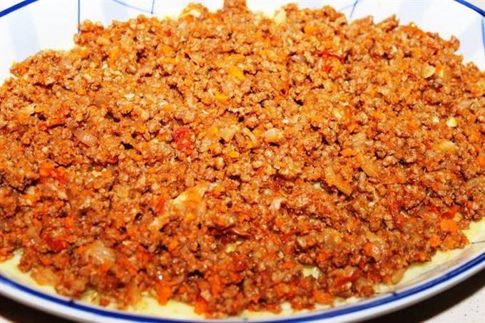 Присыпать сыром (1/4 часть) и выложить обжаренный мясной фарш.