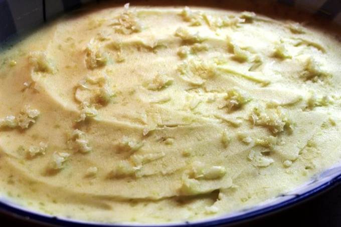Форму для запекания смазать маслом, выложить картофельное пюре. Сверху натереть чеснок