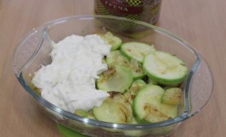 • Смешайте сыр, сметану и воду. Вылейте в гречку и перемешайте. Выложите сверху половину обжаренных кабачков, и опять сырная масса (можно сделать два слоя).