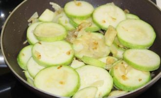 • Лук нарежьте полукольцами и обжарьте на сливочном масле до мягкости, затем добавьте кабачок, посолите, поперчите и тушите 7 — 8 минут.