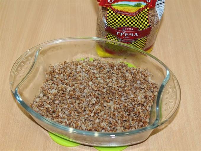 • Отварите гречку ТМ «Националь» в курином бульоне. Форму для запекания смажьте маслом и выложите половину гречневой крупы.