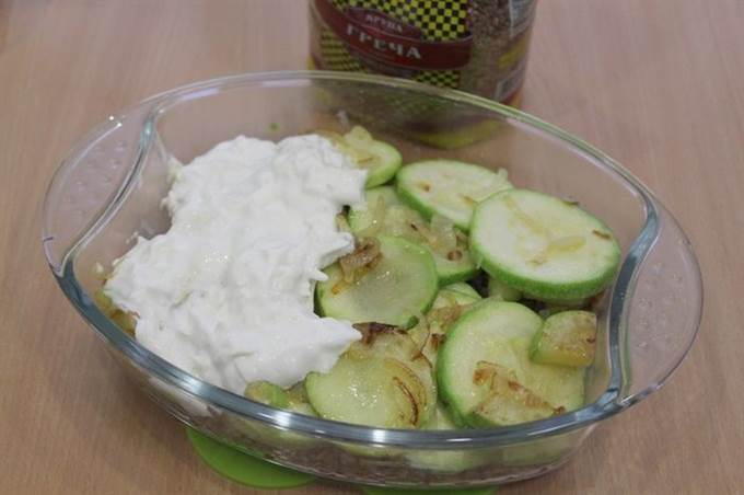 • Смешайте сыр, сметану и воду. Вылейте в гречку и перемешайте. Выложите сверху половину обжаренных кабачков, и опять сырная масса (можно сделать два слоя).