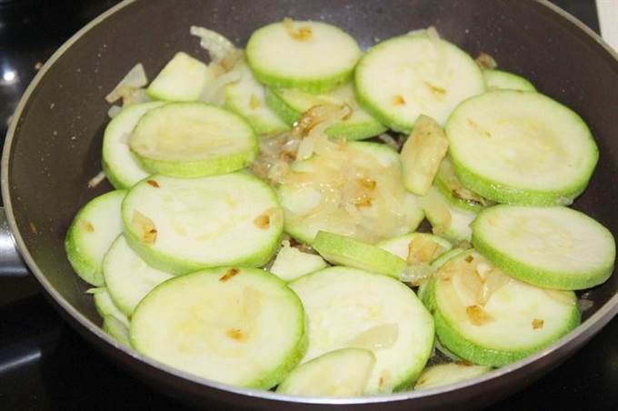 • Лук нарежьте полукольцами и обжарьте на сливочном масле до мягкости, затем добавьте кабачок, посолите, поперчите и тушите 7 — 8 минут.