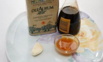 • Приготовим всё для маринада. Чеснок очистить, потереть на мелкой тёрке (или пропустить через пресс), смешать все ингредиенты для маринада в миске.