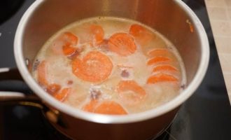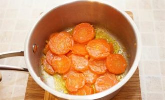 • А пока займёмся соусом. Морковь почистим, порежем на колечки и вместе с маслом и натёртым на мелкой тёрке имбирём (длиной примерно 1 см) кладём в сотейник. Заливаем водой, чтобы только покрывало морковь и варим под крышкой на среднем огне 40 минут.